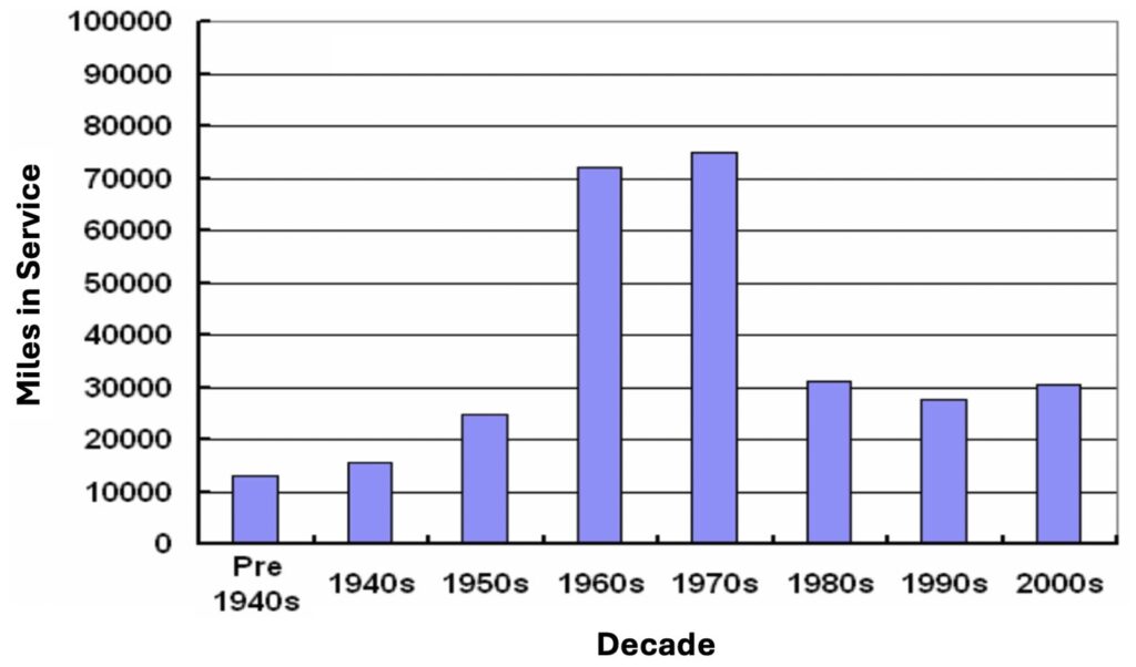 Figure 1. Miles of natural gas transmission pipeline added, by decade, in the USA. (Source: INGAA ‘Integrity characteristics of vintage pipelines’, October 2004, Figure 1, p.5)